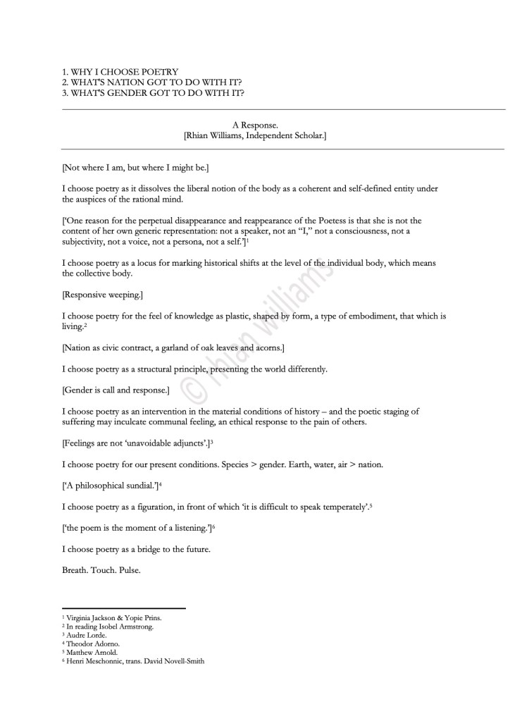 Jane Goldman, generously asked me to contribute to her response when the journal, Contemporary Women’s Writing, asked her to write a piece on ‘Scottish Women’s Poetry’ for a Special Issue. With typical intellectual verve and disruption, Jane used this as an opportunity to ask many people to join with her in asking: ‘WHY I CHOOSE POETRY? WHAT’S NATION GOT TO DO WITH IT? WHAT’S GENDER GOT TO DO WITH IT?’ and thereby ‘deliver a multiplicitous essay-poem lubricated by [those] responses’. This is my contribution. Thank you Jane.